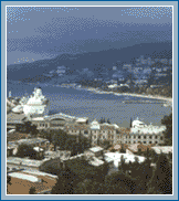 Yalta rests on the shores of the Black Sea, similar to how Santa Barbara is edged by the Pacific Ocean. A very high mountain range is its backdrop. The population is similar to Santa Barbara's and tourism is the major source of revenue.
